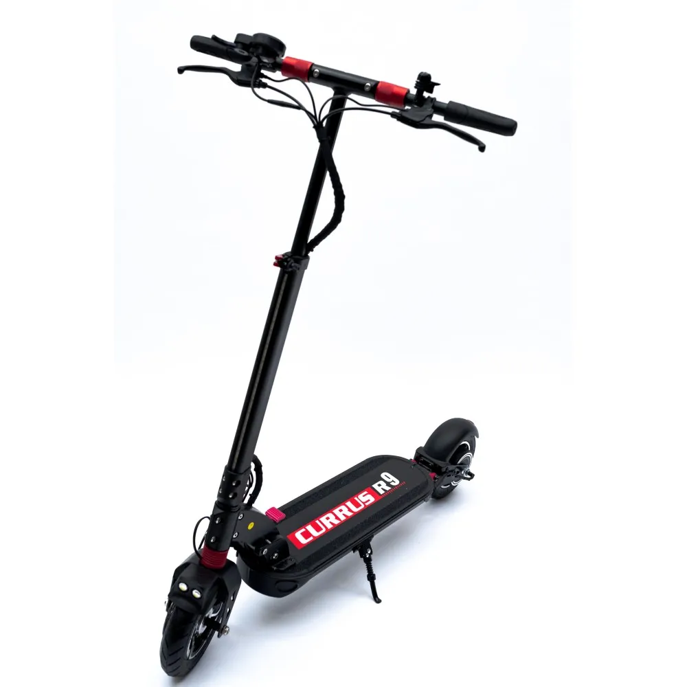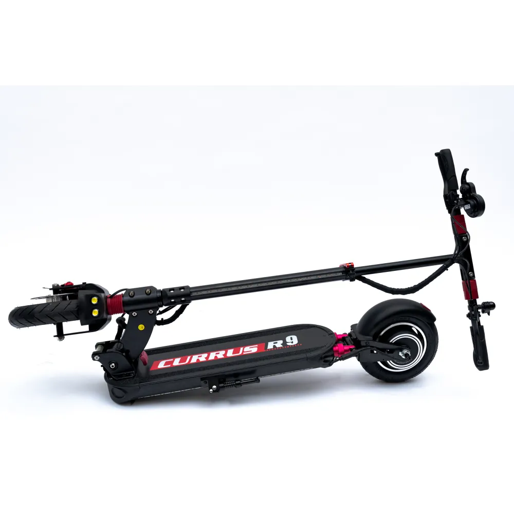 Самокат Currus R9 имеет складную конструкцию рамы, одним щелчком рулевая стойка отпускается к деке. Так самокат занимает меньше места, его можно перевозить в багажнике автомобиля. На руле установлен бортовой компьютер с дисплеем, на котором отражаются все основные показатели транспорта. Отличные технические характеристики транспорта сделали эту модель популярной.