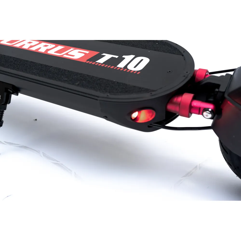 В комплектации Currus T10 емкий аккумулятор 18.2 А*ч, на одном заряде агрегат преодолевает до 40 км. После чего батарею необходимо установить на зарядку. Зарядное устройство идет в комплекте. Мощность двигателя 600 Вт, он легко въезжает на подъемы, быстро развивает максимальную скорость до 40 км/ч. Устройство оборудовано колесами 10 дюймов, его вес 24.5 кг, с критичной нагрузкой на транспортное средство до 120 кг. На переднем колесе установлены дисковые тормоза