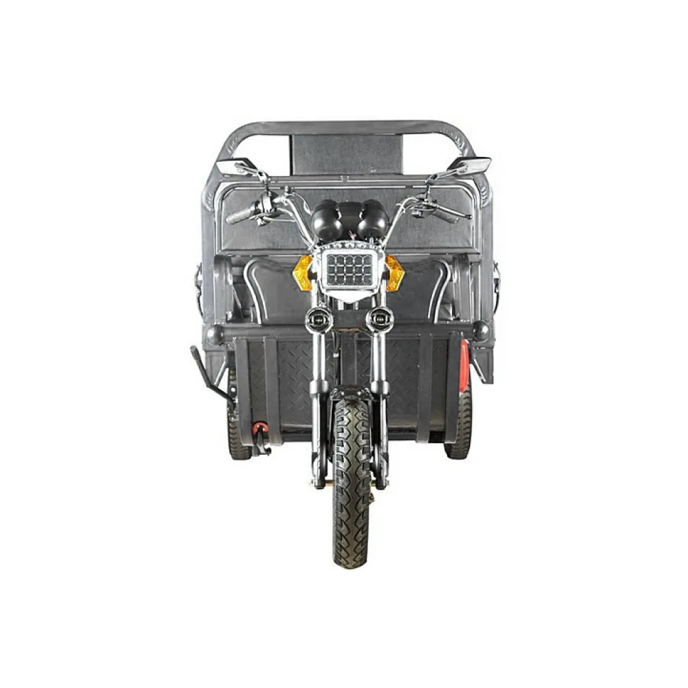Темно-серый грузовой электротрицикл Rutrike D4 1800 60V1500W практичная многофункциональная техника, обеспеченная необходимыми для комфортного использования аксессуарами и деталями. Имеет зеркала заднего вида, качественную тормозную систему, мощную светодиодную фару, компактное сиденье, повторяющее анатомические части тела и снижающие нагрузку с позвоночника.