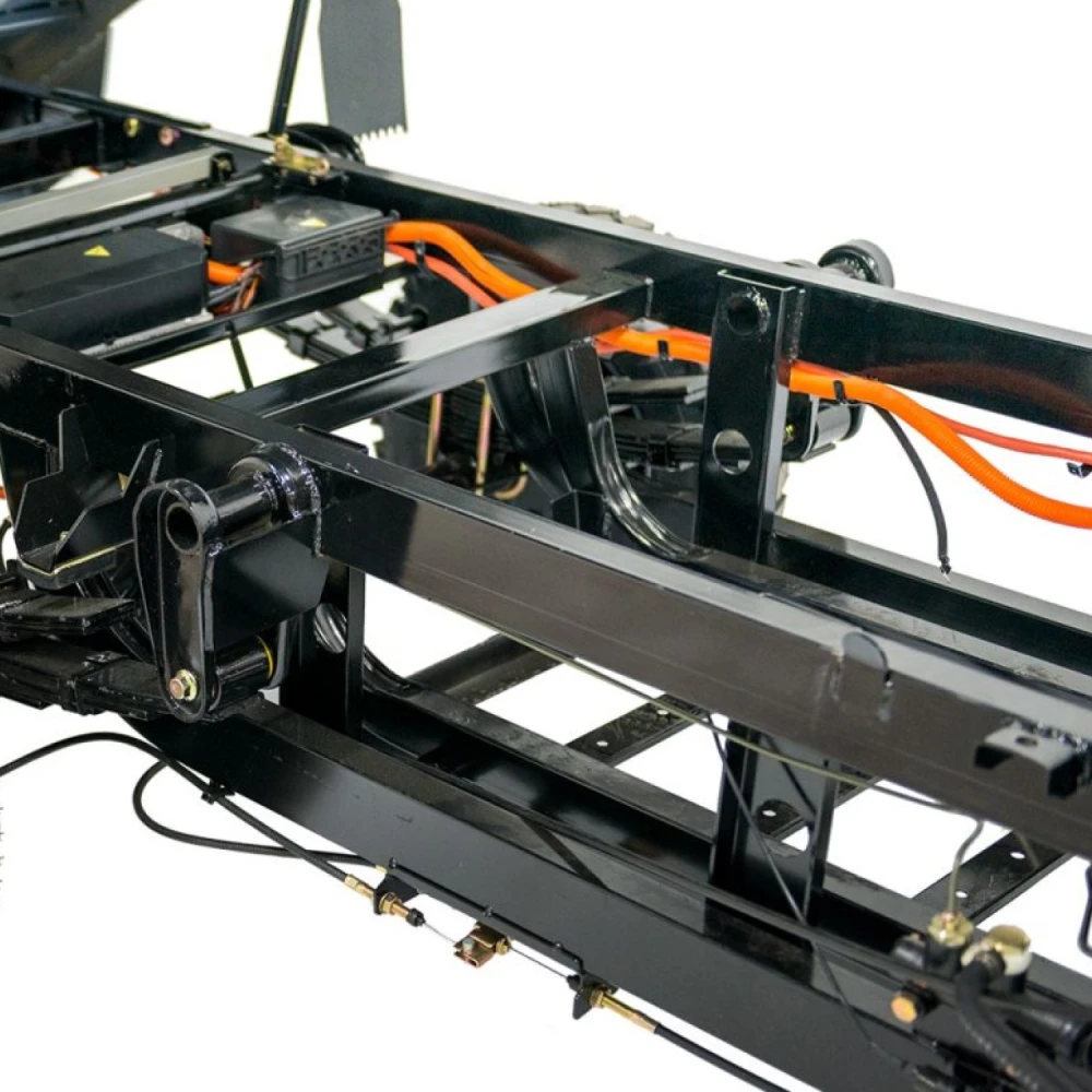 Рама из стального сплава с антикоррозийным покрытием; габариты 4100×1440×1860 мм, не складывается (транспортировка — прицепом). Дисплей: скорость, пробег, заряд; функции — сигнализация, пониженная передача. Нет круиза/Bluetooth; обслуживание простое (доступ к мотору/тормозам).