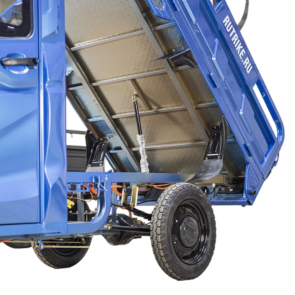 Грузовой электротрицикл Rutrike КАРГО Кабина 1500 60V1000W в темно-синем цвете - это надежное и удобное средство доставки грузов. Он обладает высокой скоростью, большим пробегом и надежным задним тормозом.