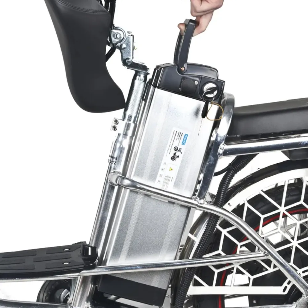 Техника оснащена фирменным двигателем мощностью 500 Вт. Увеличение скоростных характеристик до 50 км/час и повышение пробега возможно благодаря переходу на педальным режим. Широкие внедорожные шины рассчитаны для лучшего сцепления с дорожной поверхностью и движения по трассе с любым покрытием. Усиленная алюминиевая рама обеспечивает максимальную нагрузку 140 кг. Вместительная корзина на руле и усиленный багажник позволяют свободно перевозить личные вещи и покупки.