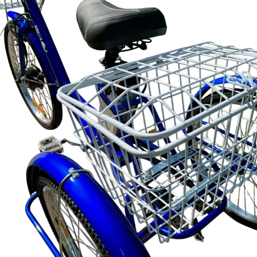 Велосипед, АКБ, ЗУ (110–240В 2A), корзины, звонок. Опции: зеркала, замок. Совместим с универсальными (крылья, багажники).