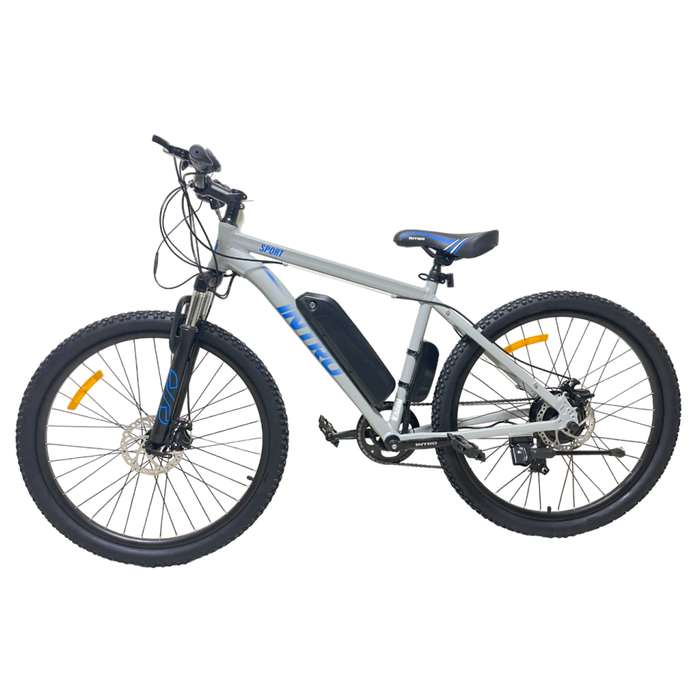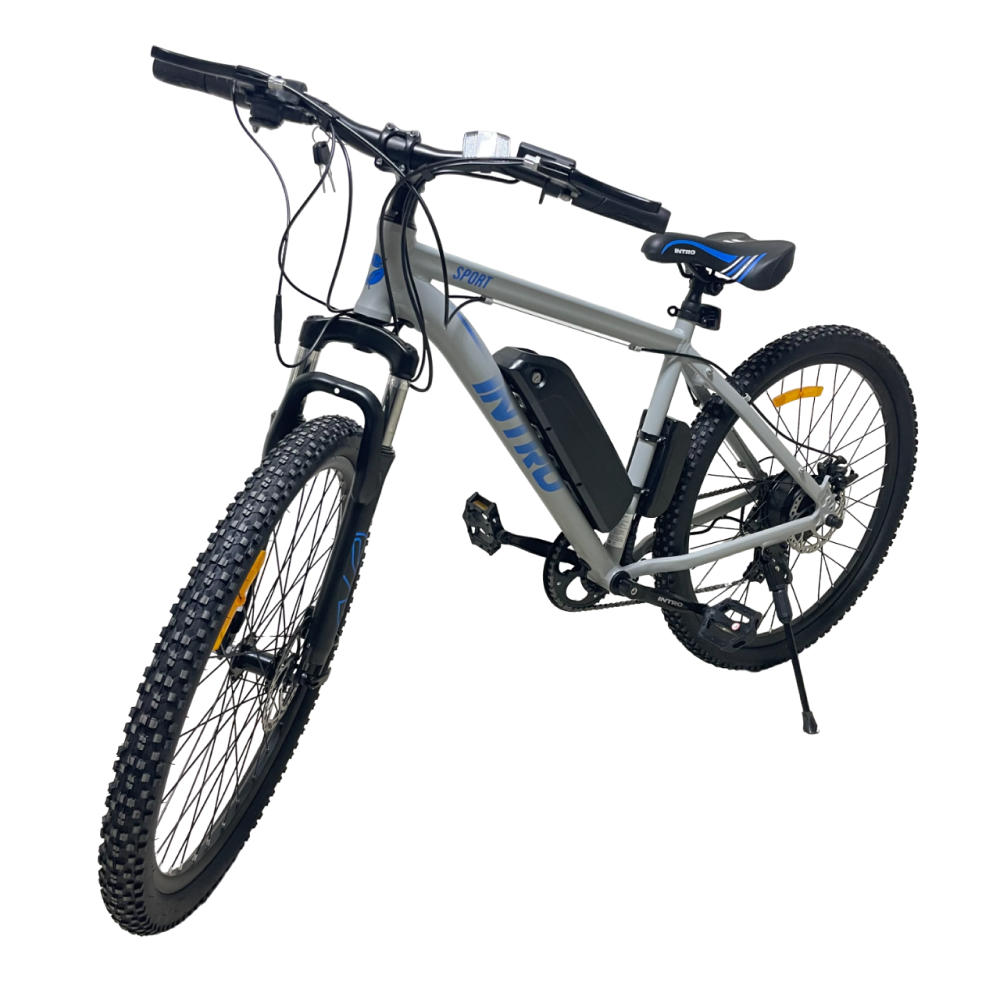 Электровелосипед INTRO Sport серо-синий - это уникальное транспортное средство, которое сочетает в себе стильный дизайн и передовые технологии. С этим электровелосипедом вы сможете наслаждаться комфортной и экологически чистой поездкой.