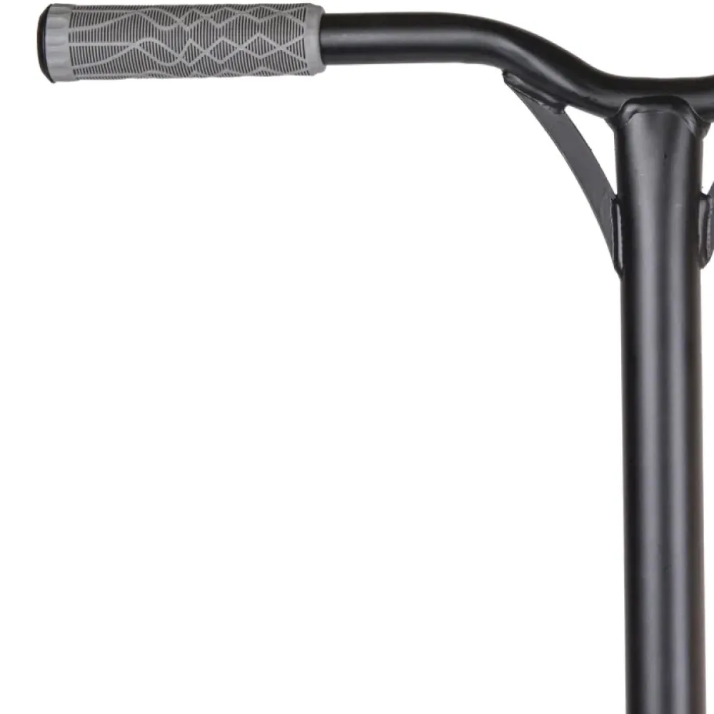 Рулевая стальная часть «Y»-образной формы по высоте от зажима составляет 57 см, от поверхности – 79,5 см. Ширина и длина – 54см*34,9см соответственно. Самокат оснащен прорезиненными грипсами и фирменными барендами, которые исключают травмирование, обеспечивают крепкую фиксацию рук. Трюкачи утверждают, форма грипс удобная, не провоцирует запотевания и случайного соскальзывания рук.